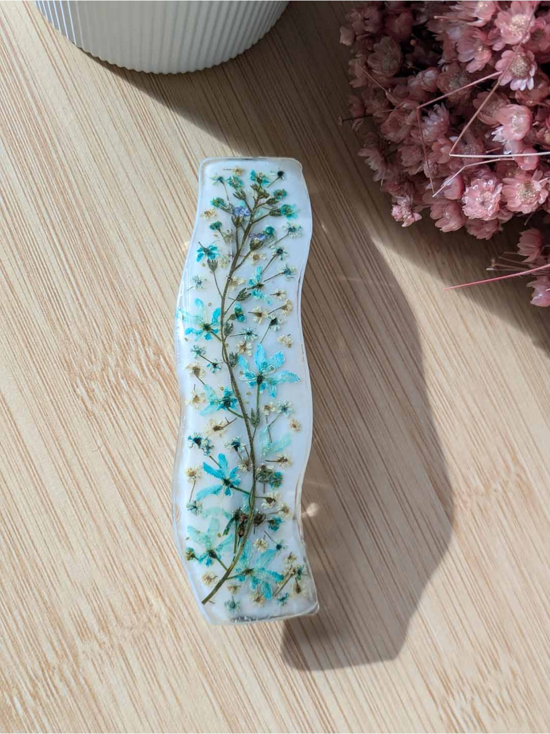 Barrette en résine blanche et fleurs bleues